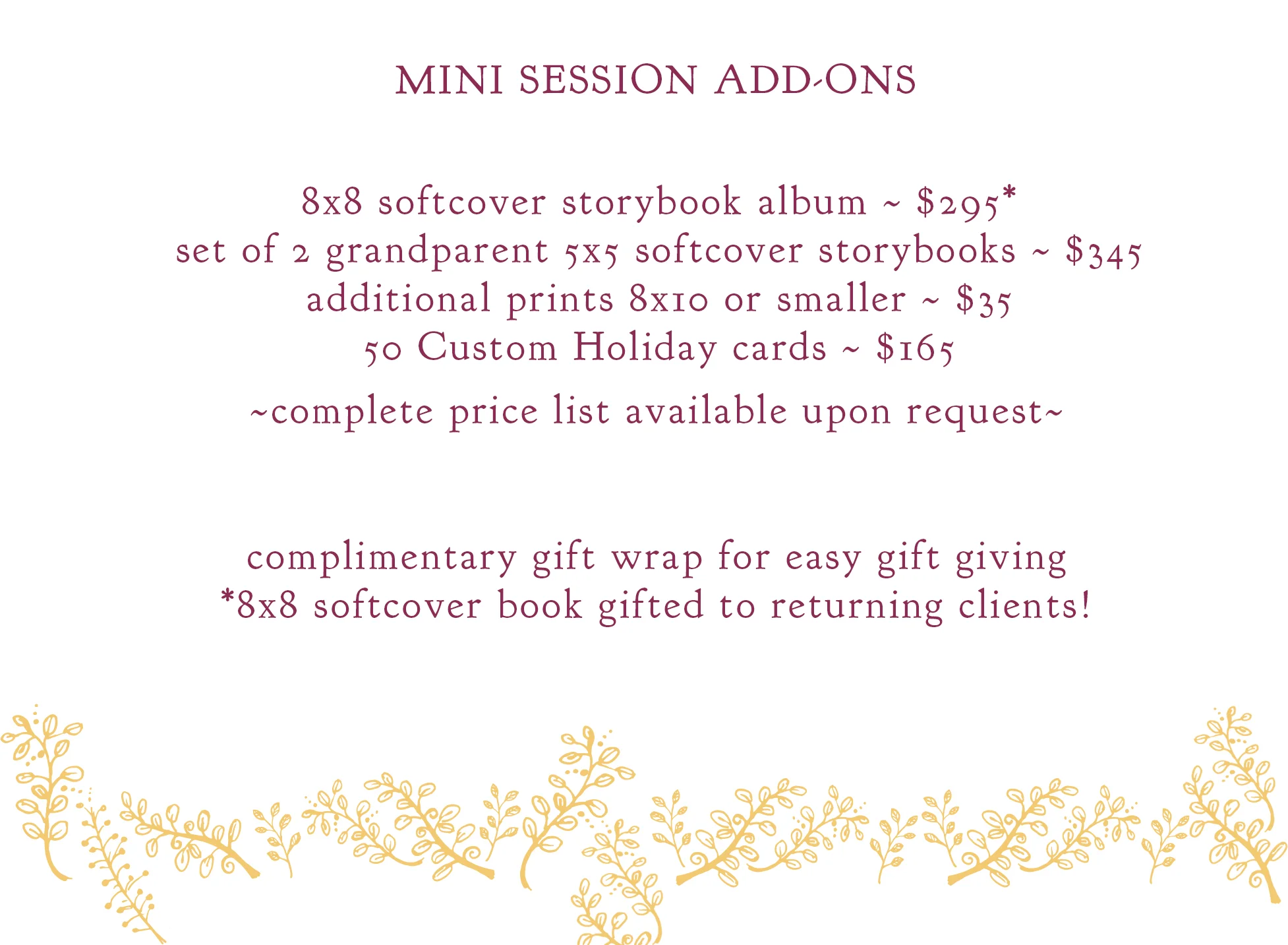 Sessions will be 20 minutes long and the session fee is $95 if booked before August 31st and $145 after August 31st. After the session, you will pick a package (see below). These packages are specially priced for mini sessions only.